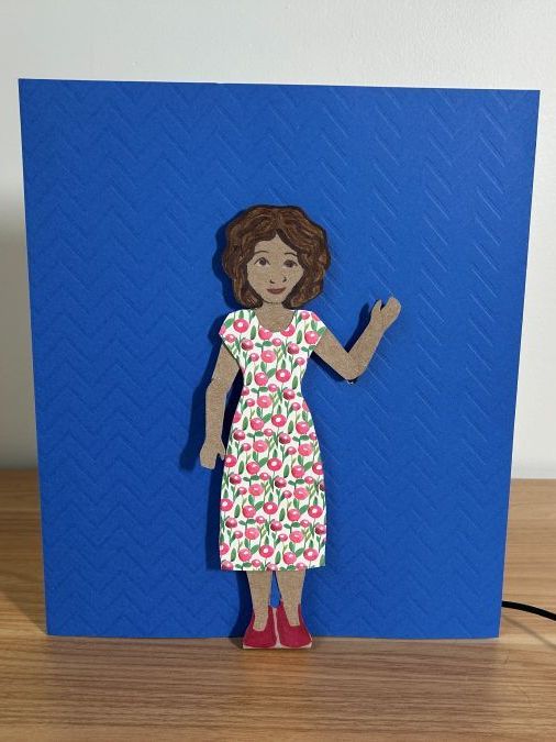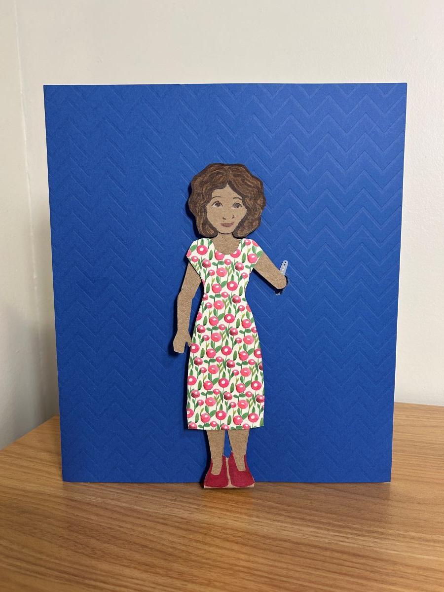 Trace the shape of the doll on a sheet of foamcore, excluding the arms, and cut it out to give the doll dimension. Attach to the back of the paper doll with mounting putty.