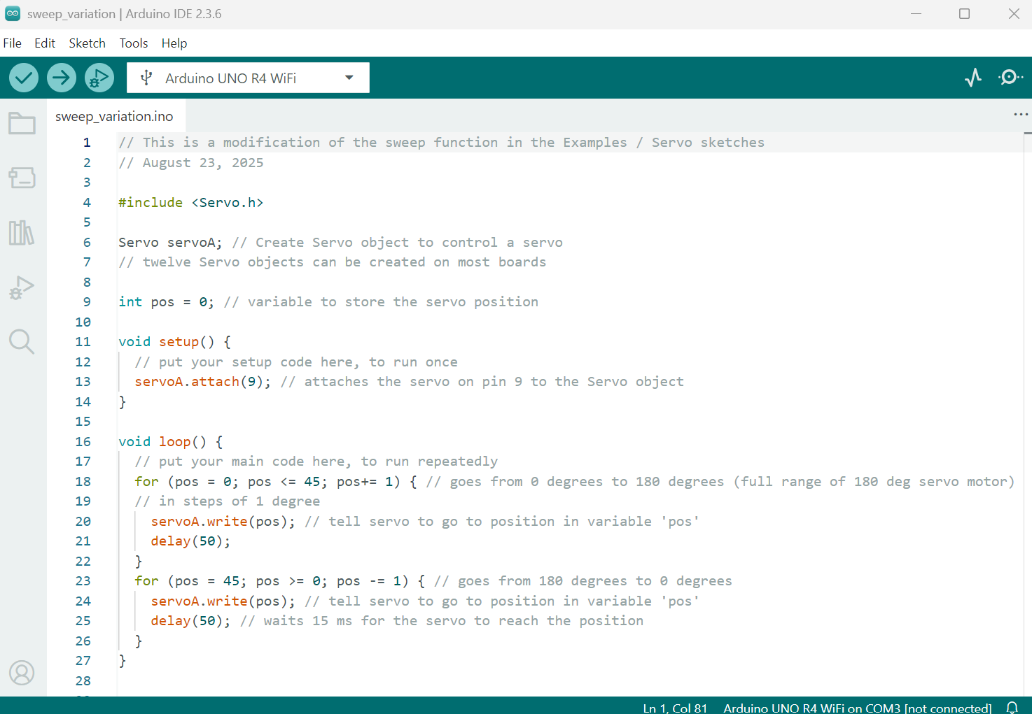 Next, modify the Sweep function so that instead of rotating up to 180 degrees, it rotates at 45 degrees. In line 22 and 27 of the sweep function, where it says 180 degrees, you will replace 180 with 45. Then, adjust the delay between each movement. In the original function, it is delayed by 15 ms, and in this modification, I adjusted it to have a delay of 50 ms so that it moves at a slower speed.