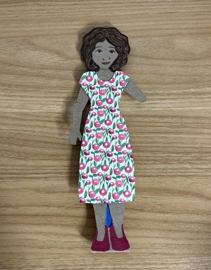 After drawing the paper doll and the mobile arm on the cardboard, cut it out using an x-acto knife or a box cutter. If you are working with children, it is okay to use scissors instead. Draw clothing for the doll on scrapbook paper and cut it out. I used mounting putty (sticky tack) to attach the clothing to the paper doll because it is easy to adjust and change if needed.