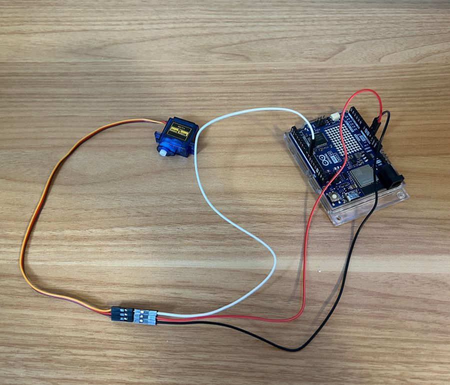 The servo motor has three wires joined together at the ends with a female connector with slots to connect to each wire. For the white Dupont wire with one pin connected to slot 9 on the Arduino Uno, plug the other pin into the servo wire harness connector at the slot facing the yellow wire. For the red wire plugged into 5V on the Arduino board, plug the pin on the other end into the slot facing the red wire of the servo motor. Lastly, for the black wire plugged into the Arduino GND slot, plug the pin into the slot facing the brown wire on the servo motor wire harness connector.
